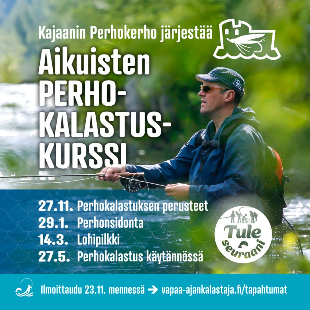 Kurssi on osallistujille ilmainen, kurssilaisilla on mahdollisuus liittyä Kajaanin Perhokerhon jäseniksi.