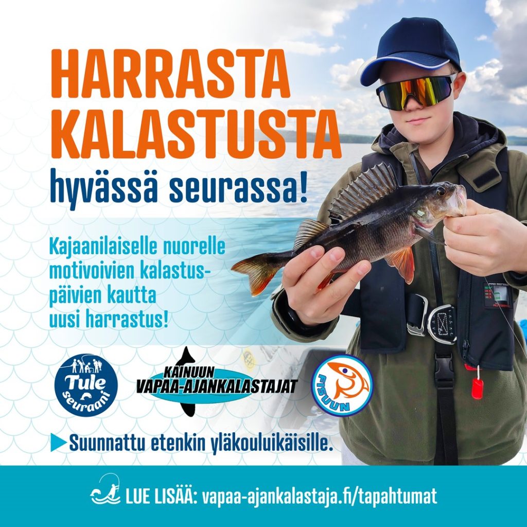 Kainuun Vapaa-ajankalastajat järjestää kajaanilaisille yläkoulu ikäisille nuorille neljä kalastusiltaa lukuvuoden 2025-26 aikana. Toiminta on osa ” Harrastamisen polun luominen” mallia, ja on osallistujille täysin ilmainen. Halutessaan nuori voi liittyä paikallisen kalastusseuran jäseneksi.