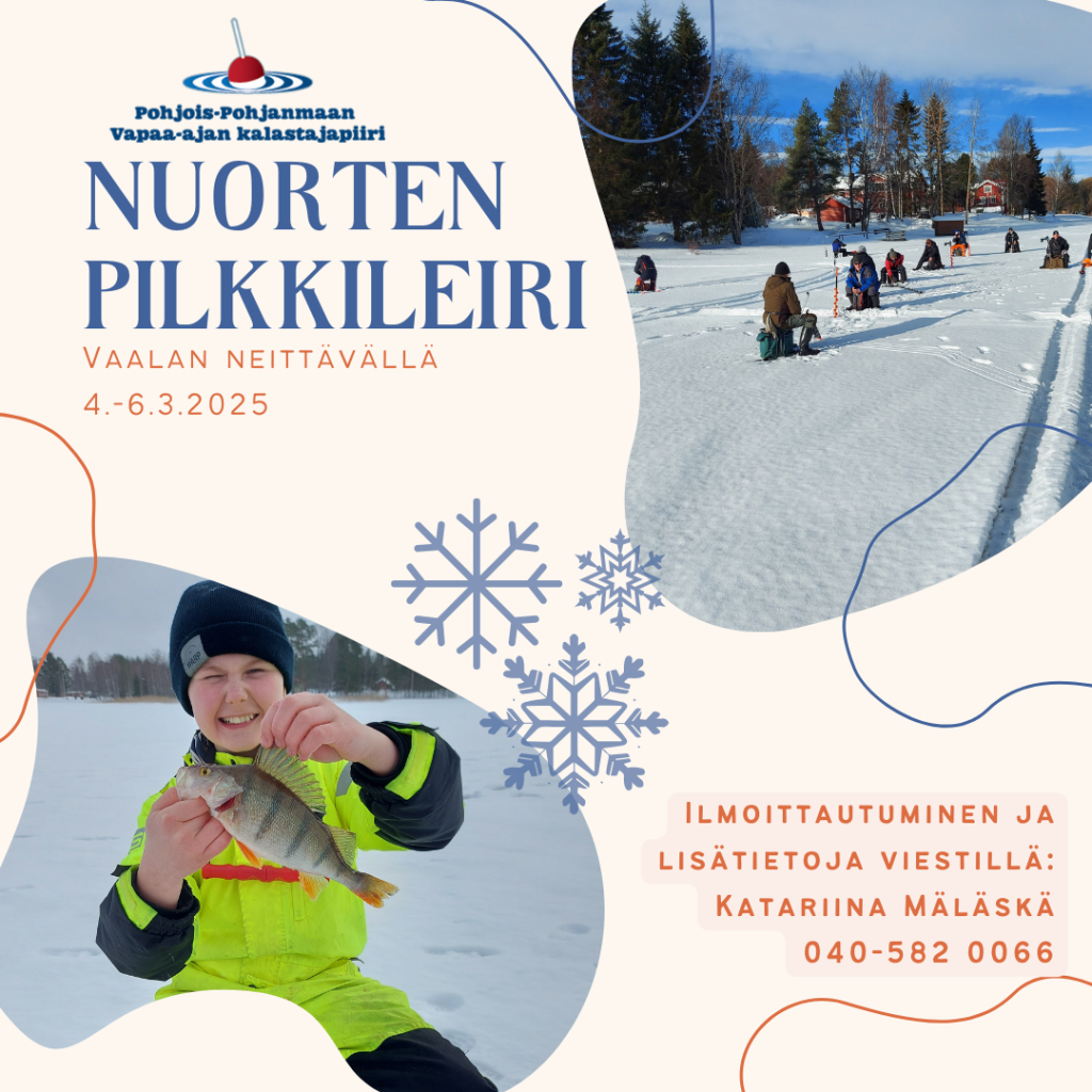 Pohjois-Pohjanmaan Vapaa-ajankalastajapiiri järjestää pilkkileirin 10–17-vuotiaille 4.–6.3.2025 Vaalan Neittävällä, Kylätalolla, osoitteessa Uutelanperäntie 18.